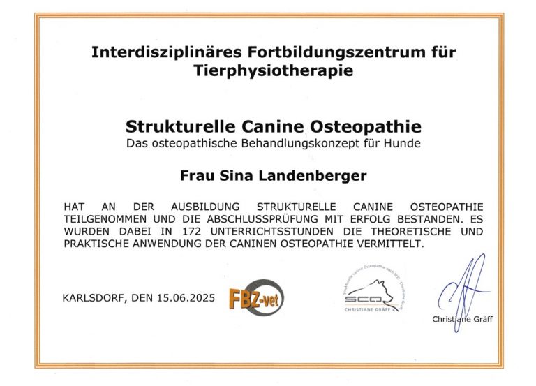 Am 15. Juni 2025 habe ich meine Ausbildung zur strukturellen caninen Osteopathie erfolgreich abgeschlossen.